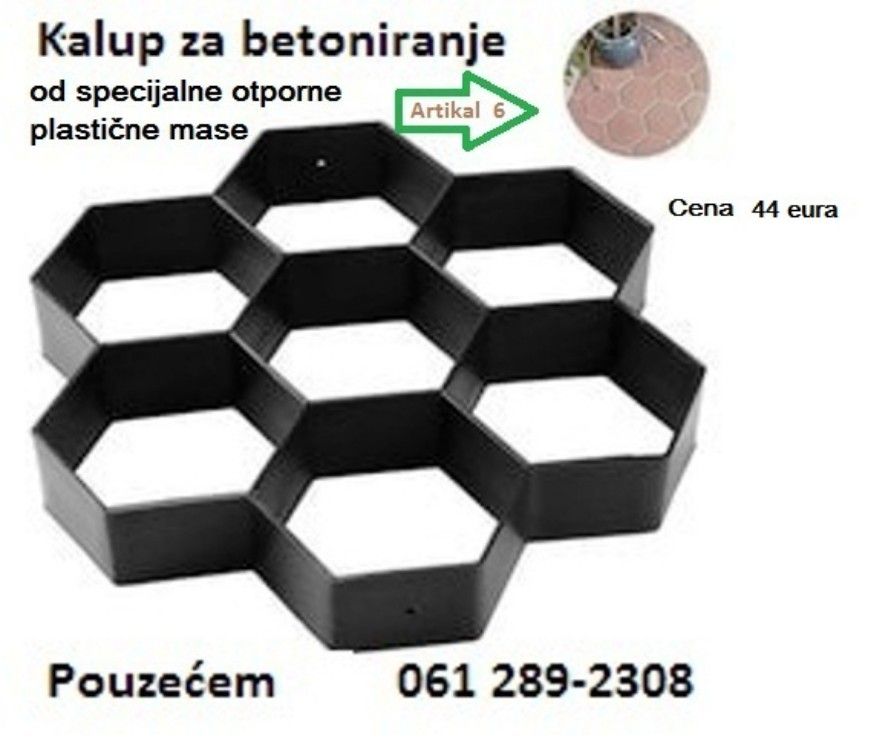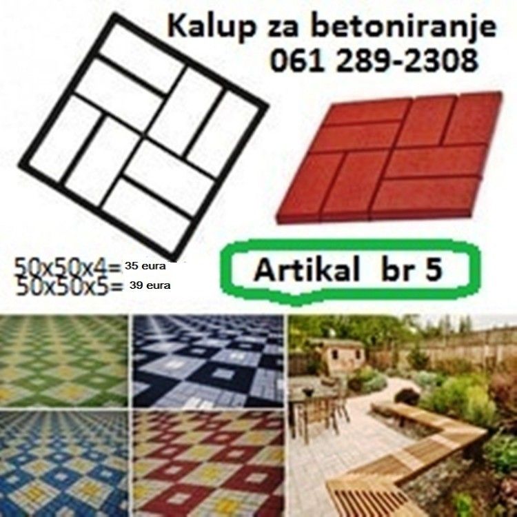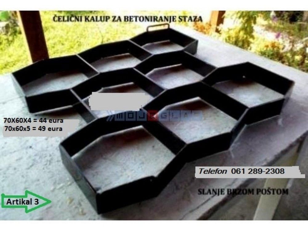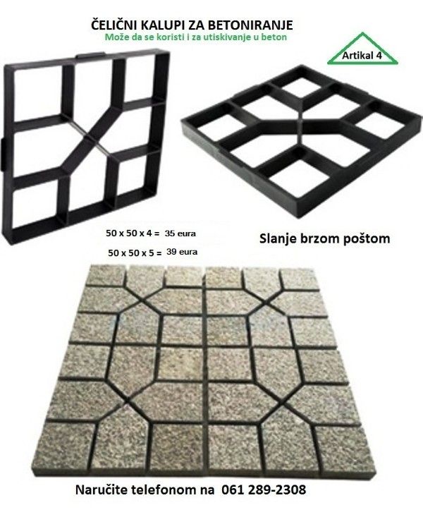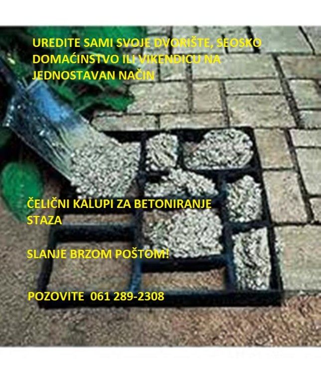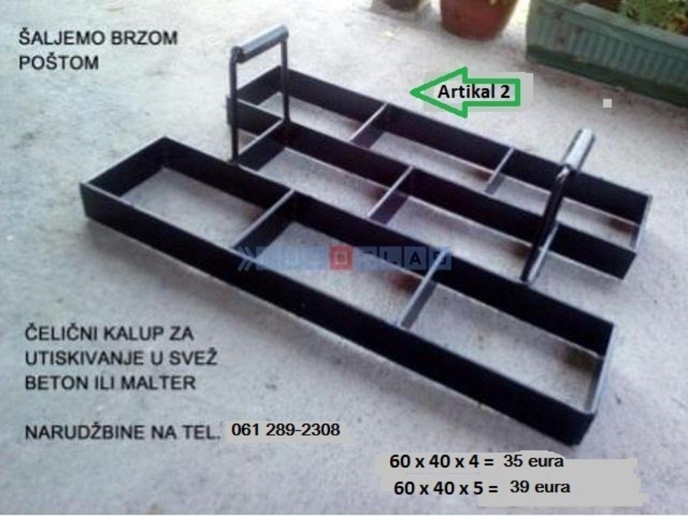 Kalupi su domaće proizvodnje, izrađene od čelika I zato su trajni, broj upotreba nije ograničen jer je urađen od čelika za trajno pa I za profesionalno korišćenje. Plastični kalupi imaju ograničen broj upotreba, dok ovaj nema rok upotrebe I trajanja. Lakša nivelacija betoniranja u odnosu na pvc kalupe. Cena: - 70x60x4 cm. - 35€ - 60x50x5 cm. - 39€ Evo vam ideje za posao. Iako se nikada profesionalno niste bavili betoniranjem staza, sa ovim kalupom I početnik vrlo lako može betonirati pešačke ili kolske staze od dvorišne kapije do kuće, balkon, parking I sl. Vrlo je jednostavno rukovati ovim kalupima. Tehniku rada sa njima možete pogledati na Youtube, Ispod ovog teksta ostavljam par linkova, gde se vidi sve do detalja: https: //youtu. be/OiKe0AMSLH8 https: //youtu. be/OGGZQBGUsjM Slanje brzom poštom. 061-289-2308. |