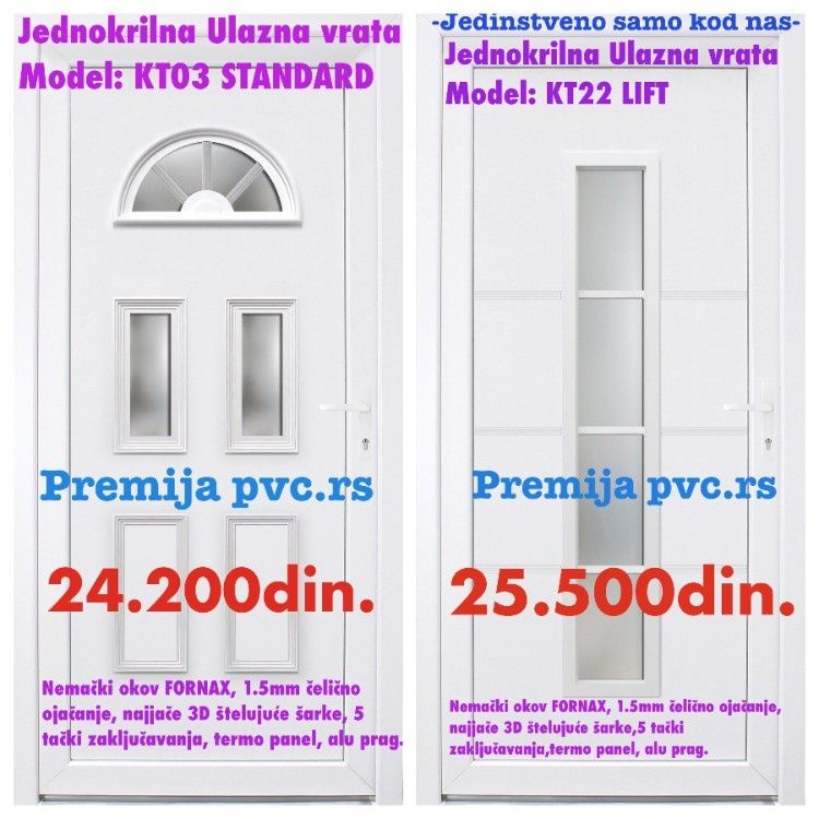 Tel. 063518555, 063/518-516, 063/518-318. Poštovani samo kod nas možete kupiti najkvalitetniju gotovu stolariju koja poseduje najzahtevnije ateste i certifikate propisane od EU, izdvajamo najbitniji EN certifikat bez kog je nemoguće nastupati u Evropskoj uniji Naša roba je u zatvorenom prostoru nije izložena kiši i suncu-potpuno je NOVA Nemački kvalitet iz Dizeldorfa Jedinstvena stolarija na našem tržištu imamo je samo mi u ponudi 7 Komora obli najdeblji profil sa 3 originalne Dihtung gume, maksimalno povećan toplotni i zvučni koeficijent 36db. Nemački okov, kip mehanizam, 1.5mm ČELIČNO OJAČANJE, duplo termoizolaciono staklo 4mm+16mm+4mm, štelujuće šarke, alu prag, 100% najboljeg kvaliteta (Pažnja u ponudi imamo originalne proizvode, posedujemo originalne CERTIFIKATE proizvoda o kvalitetu sa od |