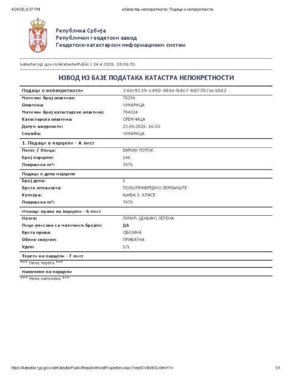 | Na prodaju njiva na ulazu u Sremčicu sa desne strane, KO 146 Bićin potok,