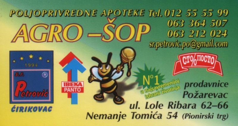 - Poljoprivredna mehanizacija, rezervni delovi - Baštenski alati, kosačice za travu, plastična galanterija - Hrana za kućne ljubimce, oprema za pčelarstvo - UPIS: tovnih pilića, tovnih ćurića, koka nosilja - Prodaja poljoprivredne mehanizacije NEW HOLLAND Požarevac, ul. Lole Ribara 62-66 Nemanje Tomića 54 (Pionirski trg) Tel: 012/55-55-99, 063/364-507, 063/212-024 |