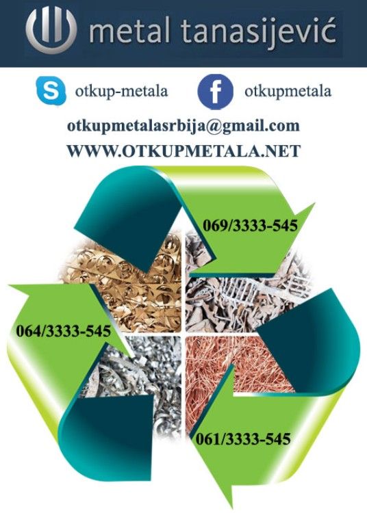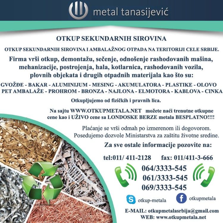 Firma Metal 011 Tanasijević vrši otkup sekundarnih sirovina, otkup bakra, otkup cinka, otkup gvoždja, otkup aluminijuma, otkup mesinga, otkup prohroma, otkup olova, otkup bronze. Takodje vršimo demontažu, sečenje i odnošenje rashodovanih mašina, mehanizacije, postrojenja, hala, kotlarnica, rashodovanih vozila, plovnih objekata i drugih otpadnih materijala. Plaćanje se vrši odmah po izmerenom ili dogovorom. Posedujemo dozvole od Ministarstva za zaštitu životne sredine. Otkup vršmo od pravnih i fizičkih lica. Za sve ostale informacije pozovite na +381 69/ 3333 – 545 +381 64/ 3333 – 545 +381 61/ 3333 – 545 |