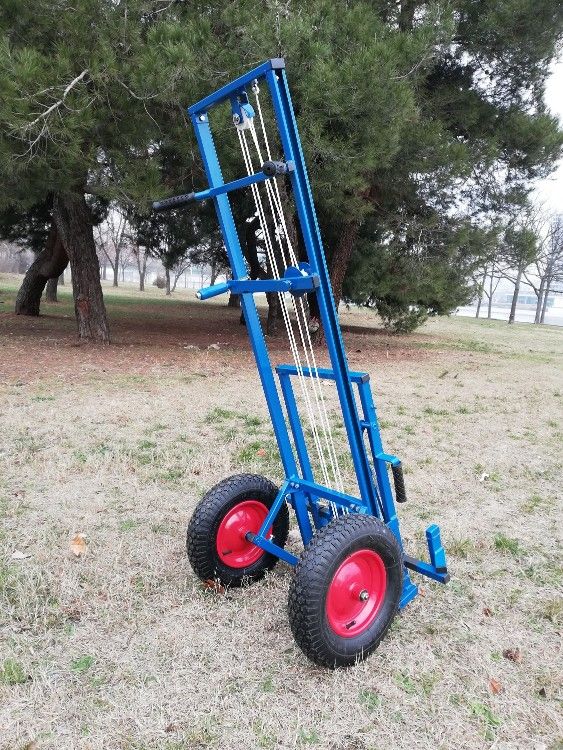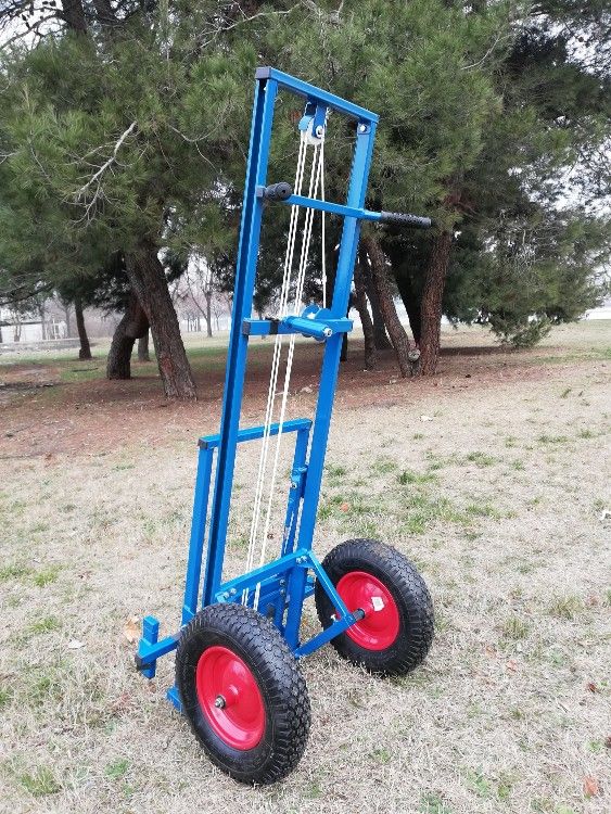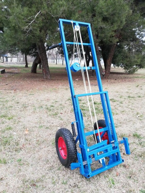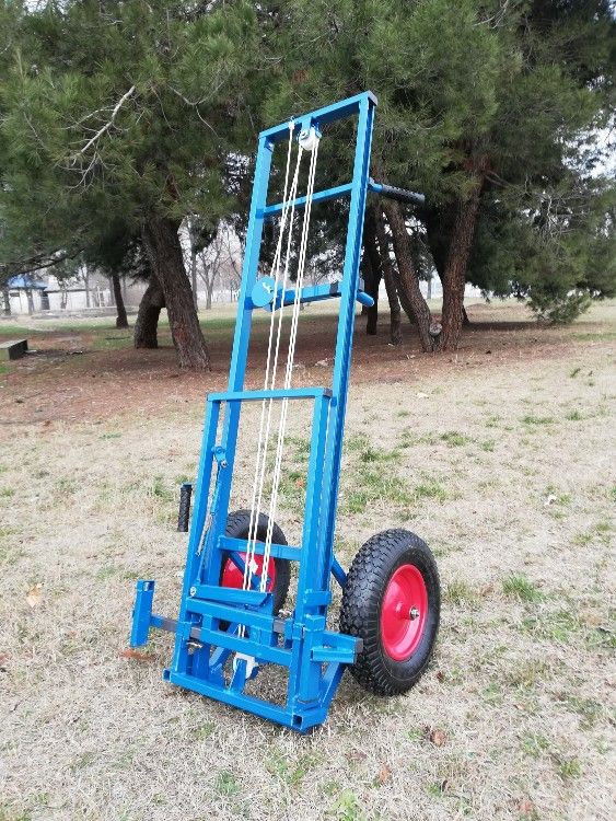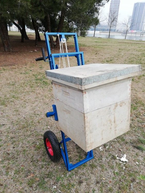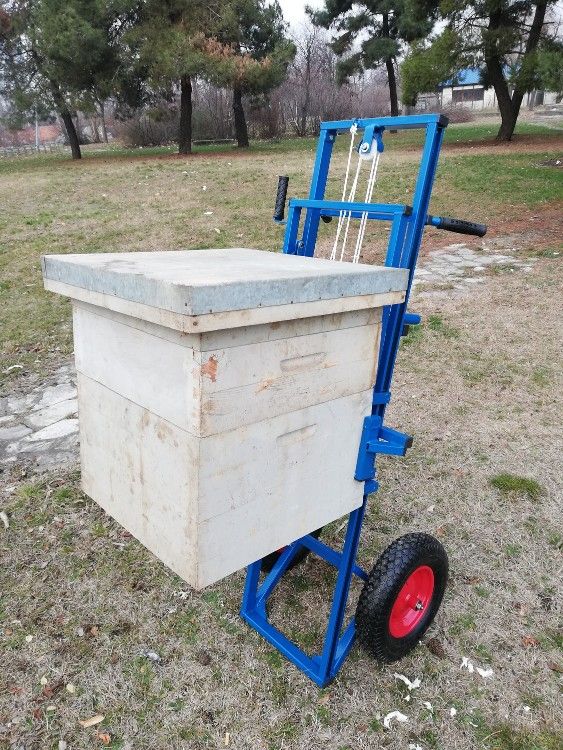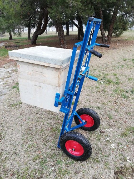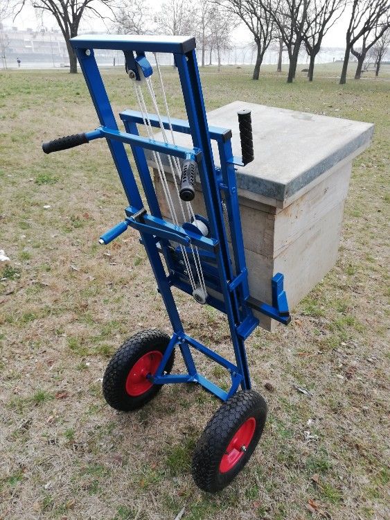 Apilift za podizanje, prenošenje i rad sa košnicama i drugim teretima. Košnice zahvata sa strane bočnim stegama ili odozdo horizontalniim viljuškama kao klasičan viljuškar. Maksimalna širina zahvatanja 60 cm, minimalna širina 36 cm. Podiže terete do max. 100 kg. Maksimalna visina podizanja 120 cm. Promenljiv položaj točkova, rašireni ili skupljeni. | |