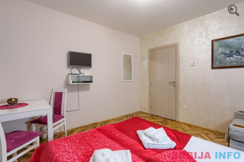 | Apartmani Zlatibor - Apartman Magija nalazi se u naselju Sunčana Dolina koje spada u najlepša naselja na Zlatiboru. Ovaj studio apartman od 28m2 u mogućnosti je da pruži smeštaj za četiri osobe i opremljen je kompletno, tako da ćete imati sve što vam jeste i nije potrebno na odmoru. Iako je manje kvadrature, napravljen je sjajan raspored i prostor je potpuno funkcionalno iskorišćen, pa ćete se osećati vrlo komotno. Ima odvojenu kuhinju u kojoj možete pripremati sebi obroke, i lepo malo kupatilo. Prostoriju u kojoj se nalazi francuski ležaj i fotelja na rasklapanje, krasi moderan enterijer sa akcentom na crvenu boju. Kao i svi naši apartmani Zlatibor, cene se najviše kompletna opremljenost koja pored navedenih stvari podrazumeva i TV, internet i čistu posteljinu i peškire, pa vam ovom u apartmanu zaista ništa neće nedostajati. Apartman Magija smešten je u neposrednoj blizini autobuske stanice, tržnog centra, hotela Mona i drugih zlatiborskih turističkih atrakcija. Naravno, na svakom koraku su vam dostupni i restorani domaće kuhinje, kafići i poslastičarnice. Zbog svega navedenog potpuno je savršen za parove, ali i za duži boravak, na osnovu čega se apartmani Zlatibor cene najviše. Lokacija: Zelenkada bb, Zlatibor, Srbija Dodatne informacije: Broj soba: 1, Broj kupatila: 1, Površina: 28 m2 +381 63 322 092 +381 64 637 0527 bgdapartmani@gmail.com | |