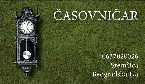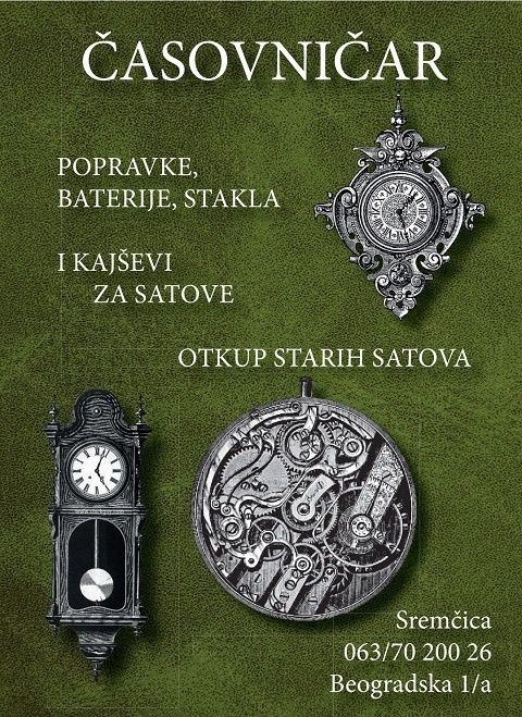 Nalazimo se u Sremcici, u ulici Beogradska 1a - Pijaca Gorica. Kontakt telefon – 063/702-00-26 Popravke svih vrsta satova, rezervni delovi, baterije, godinu dana garancije na sve servise... Popravke svih vrsta satova, kvarcni, mehanicki, automatici.. PREGLED I PROCENA BESPLATNA ! Poliranje kucista, stakla i izrada stakla. Kaisevi za satove u svim bojama kozni, silikonski, platneni, metalni. Sve vrste baterije za satove i auto kljuceve. Original Renata baterije sa garancijom od godinu dana. Kljucar Izrada svih vrsta kljuceva, osim autokljuceva. Obicni kljucevi sa zubima, tackasti kljucevi, tagovi za brave… Nas servis satova pokazuje pouzdanost uvek se trudi da poveca zadovoljstvo nasih klijenata. Dodjite i budite i Vi jedan od nasih zadovoljnih klijenata. Za vise informciija: 063/702-00-26 | |