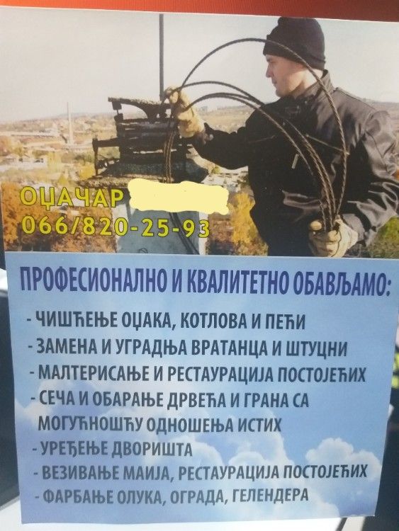 | Ciscenje dimnjaka, peci i kotlova, seca i obaranje stabla, uredjivanje dvorista, krecenje, farbanje oluka, ograda itd. Vezivanje maija... | |