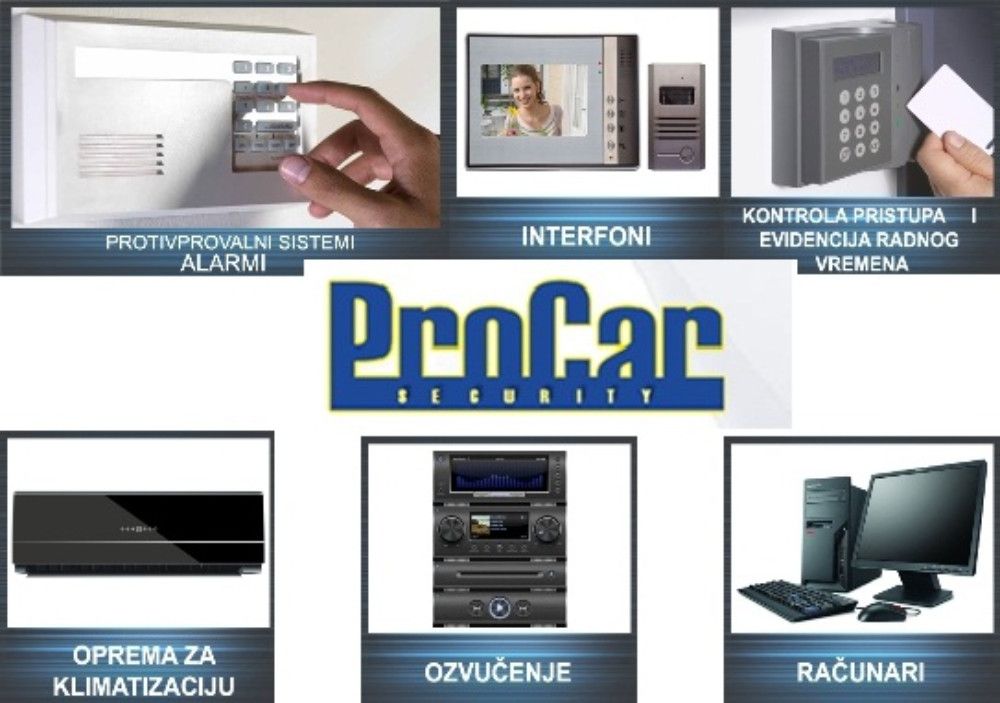 Firma PROCAR SECURITY, d. o. o. , sa sedištem u ul. Bačka 68a, u Zemunu. Osnovna delatnost firme je ugradna i projektovanje CCTV (VIDEONADZORA) i PROTIVPROVALNIH sistema (ALARMA), a kao prateće delatnosti nudimo prodaju i ugradnju INTERFONSKIH sistema, KONTROLE PRISTUPA i EVIDENCIJE RADNOG VREMENA. Sva radna mesta su opremljena sa potrebnom tehnološkom opremom za izradu, montažu i ugradnju. Firma se osim toga bavi montažom opreme za ozvucenje i klimatizaciju, prodajom i servisiranjem računara, računarskih mreža i izradom sajtova. Vise informacija na: http: //www.procar.rs/ Kontakt: 011/3167331; 063/394343 | |